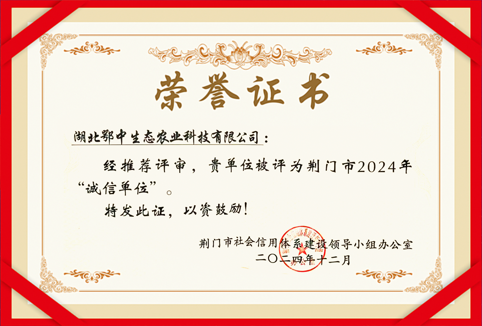 誠以立身 信以行遠 鄂中農(nóng)科獲評“2024年度誠信單位”
