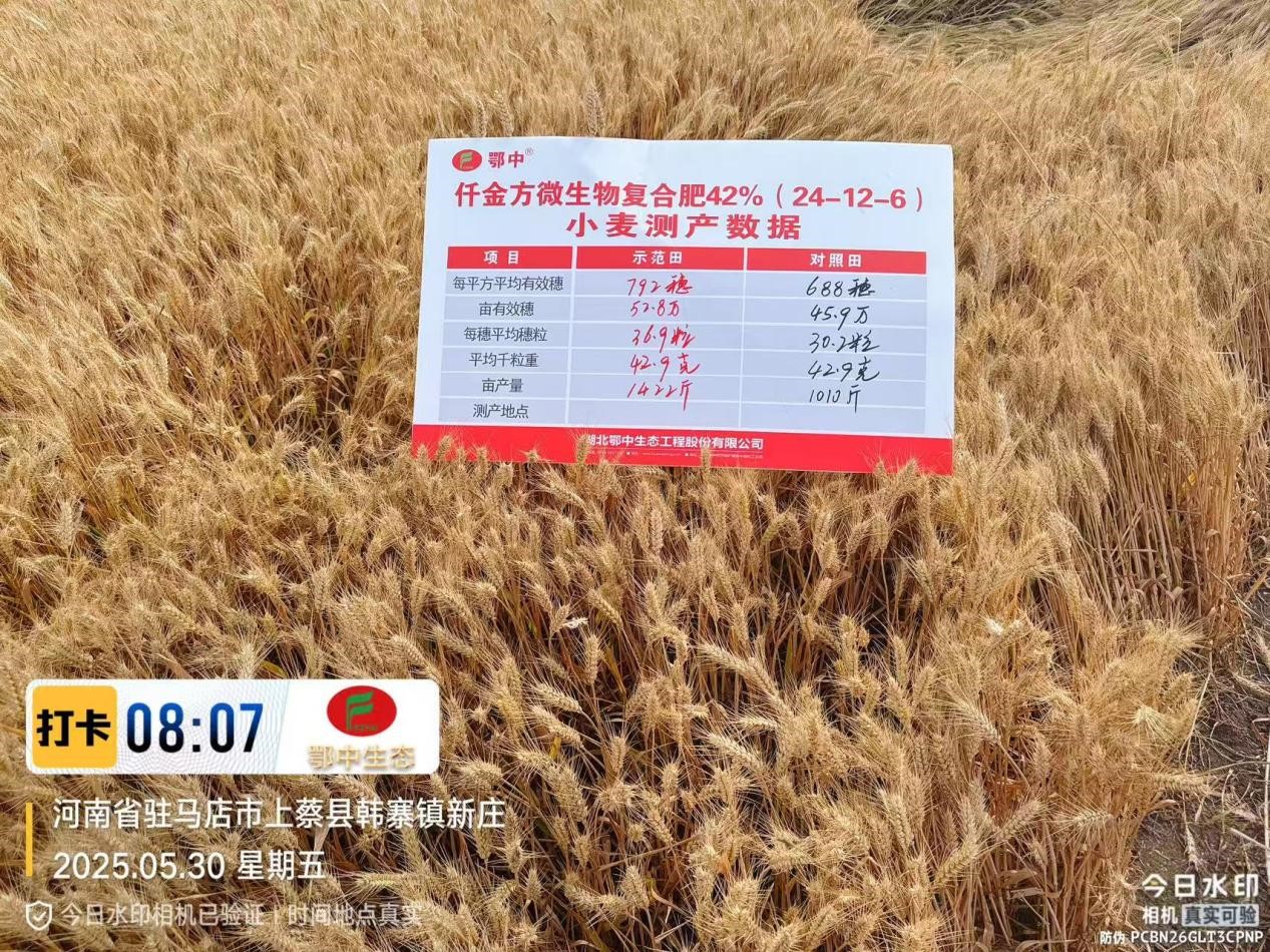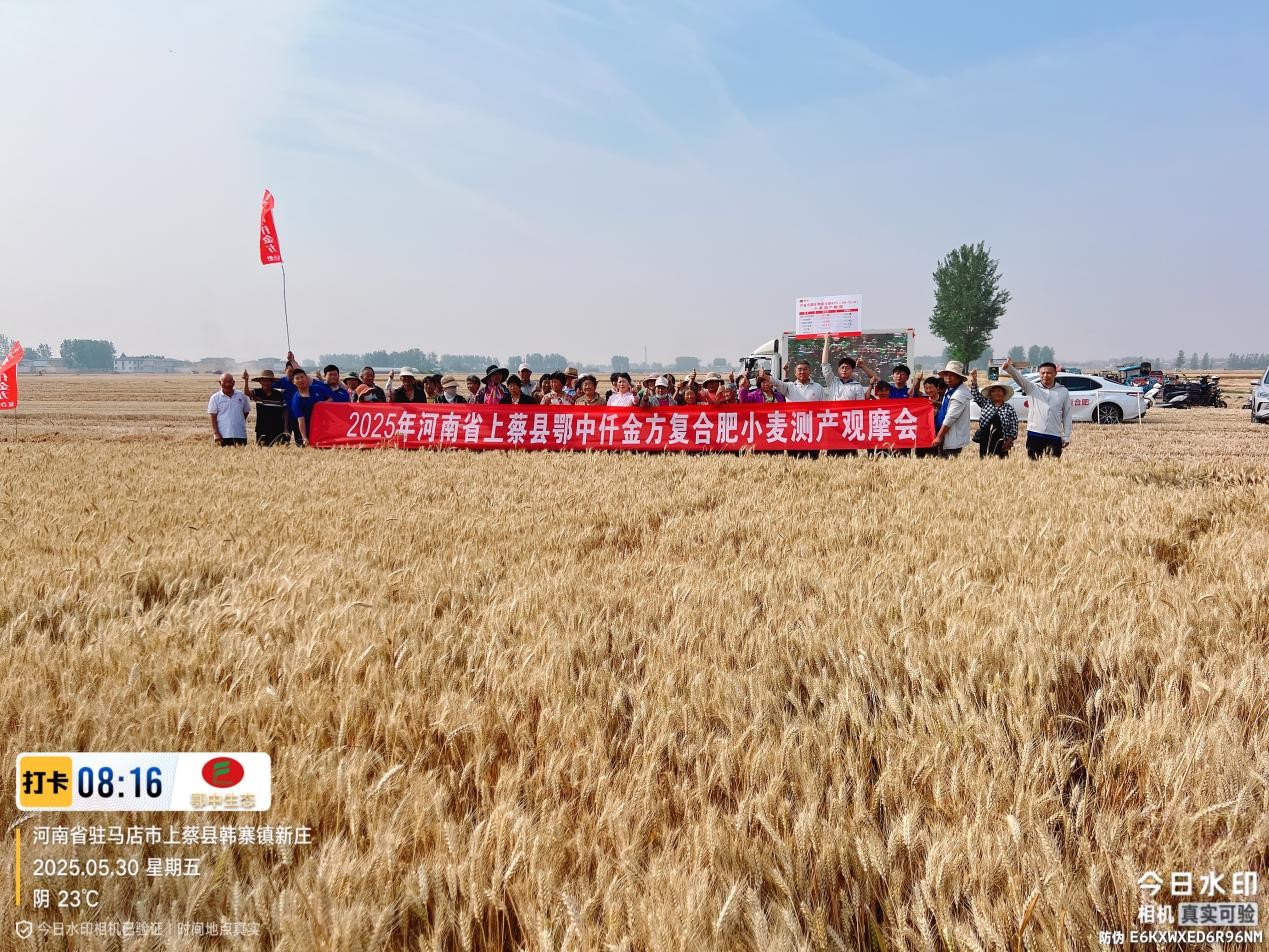 另一場測產(chǎn)會(huì)在上蔡韓寨鎮(zhèn)舉行,重點(diǎn)關(guān)注小麥種植。該鎮(zhèn)從去年上半年開始推廣仟金方花生肥,并在花生收獲期得到了用戶的肯定。去年下半年小麥種植季節(jié),盡管小麥經(jīng)濟(jì)價(jià)值不高,部分農(nóng)戶仍然選擇繼續(xù)使用仟金方肥料。在整個(gè)小麥生育期,使用過仟金方產(chǎn)品的小麥與周邊地塊的長勢形成了鮮明對比。在近期小麥?zhǔn)斋@期,公司配合當(dāng)?shù)剞r(nóng)技部門組織了現(xiàn)場測產(chǎn),結(jié)果顯示,使用過仟金方的地塊與對照田相比,畝產(chǎn)量增產(chǎn)400余斤。
