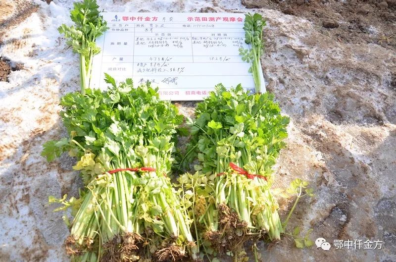 早7:30,測產觀摩現場已經彩旗飄飄,鄂中智慧農化音響服務車視頻音響傳播在新野縣蔬菜基地,上午八點現場就已經聚集了100多人,示范戶梁東獻掀開大棚,迫不及待的把大家邀請到仟金方西芹示范田里,激情滿懷的講解鄂中仟金方顯著減肥增產效果。他邊說:我種植西芹4年了,8畝蔬菜基地從沒見過這么有實效的肥料。邊向大家講解示范田和對照田施肥技術:我在苗期定值前每畝施用鄂中仟金方42%(12-6-24)80斤做基肥;對照田每畝施用其它廠家復合肥54%(18-18-18)100斤做基肥;示范田西芹無死苗,亂根現象,對照田亂根死苗很多,邊角葉也發(fā)黃的快。生長期施用的磷酸銨鈣、復合肥做追肥都相同,示范田減少了農藥及人工投入兩次,到成熟期顯示的效果讓我驚奇。