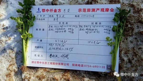 芹菜(西芹)測產結果:選取鄂中仟金方42%(12-6-24)和對照田其它廠家復合肥54%(18-18-18)中間區(qū)域西芹進行隨機取樣,選取3組,每組0.5平方米,觀摩會新型職業(yè)菜農現場監(jiān)督取樣,鄂中仟金方中醫(yī)養(yǎng)護隊員和示范戶親自采收,保證采收程度相同,采收136株,3組綜合測產,仟金方區(qū)域47.3斤,對照區(qū)域38.2斤,增產9.1斤,畝增產4040.4斤。折除水分測算,平均畝增產3401.7斤。按70%商品計算為2381.2斤,按當前批發(fā)價0.8元每斤,畝增收1904.96元。減少肥料投入36.9%,示范田減少農藥及人工投入兩次,平均畝節(jié)本95元,畝節(jié)本增效1999.96元,鄂中仟金方施用減肥增效明顯。