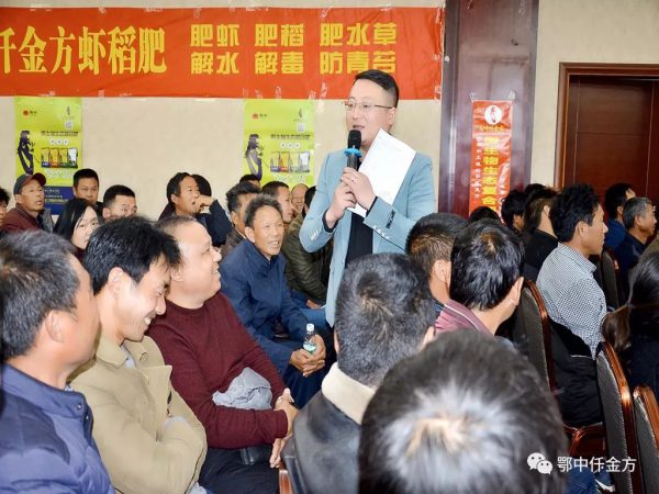 近年來、蝦稻共作養(yǎng)殖由湖北潛江不斷向大荊門拓展,僅沙洋地區(qū)目前已達(dá)到1萬余畝。蝦稻共作養(yǎng)殖是一門技術(shù)活。技術(shù)好,多賺錢,特別是水肥管理技術(shù)到位抗風(fēng)險!鄂中生態(tài)順應(yīng)綠色生態(tài)發(fā)展,于2017年推出了鄂中仟金方蝦稻套餐肥。鄂西分公司經(jīng)理田興在會議致辭中介紹了蝦稻套餐肥:配以鄂中復(fù)合微生物菌劑(液體5億菌),形成了蝦稻專用套餐,特別適用于蝦稻生態(tài)連作共作、稻田養(yǎng)蟹等,具有肥蝦肥稻肥水草,解水解毒解殘留,防蝦病防稻病防青苔等特別功效。先后在潛江、監(jiān)利等蝦稻共生區(qū)試驗示范效果顯著,被納入監(jiān)利縣農(nóng)業(yè)耕地質(zhì)量保護(hù)與肥料技術(shù)實驗示范推廣項目。西南大區(qū)總經(jīng)理杜水清把市場調(diào)研的PPT減少到80%,只講蝦稻防青苔一個點。市場部部長鄧君清詮釋仟金方宏觀趨勢及訂貨政策發(fā)布。整場講解不超過30分鐘。