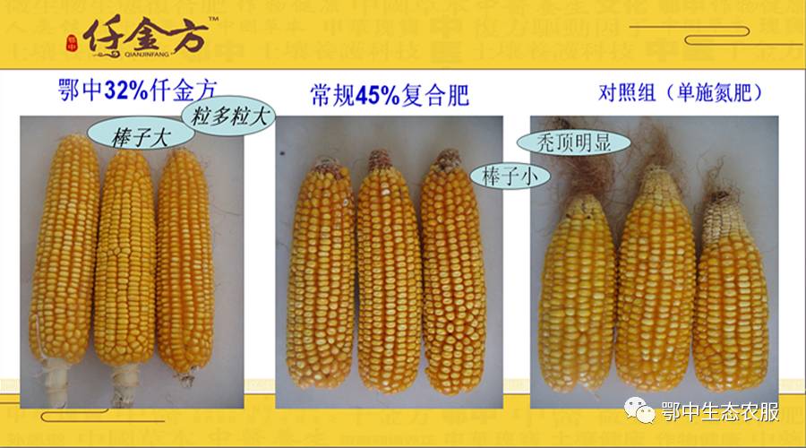 結(jié)果:1.仟金方19-5-8明顯比常規(guī)15-15-15個(gè)子高,棒子大、籽粒均勻、整齊緊湊,須根更多,葉片更大,顏色更綠;2.最后測(cè)產(chǎn)表明:仟金方19-5-8比常規(guī)15-15-15增產(chǎn)12.97%,說(shuō)明施用鄂中仟金方微生物生態(tài)復(fù)合肥具有一定的節(jié)肥增產(chǎn)的效果。