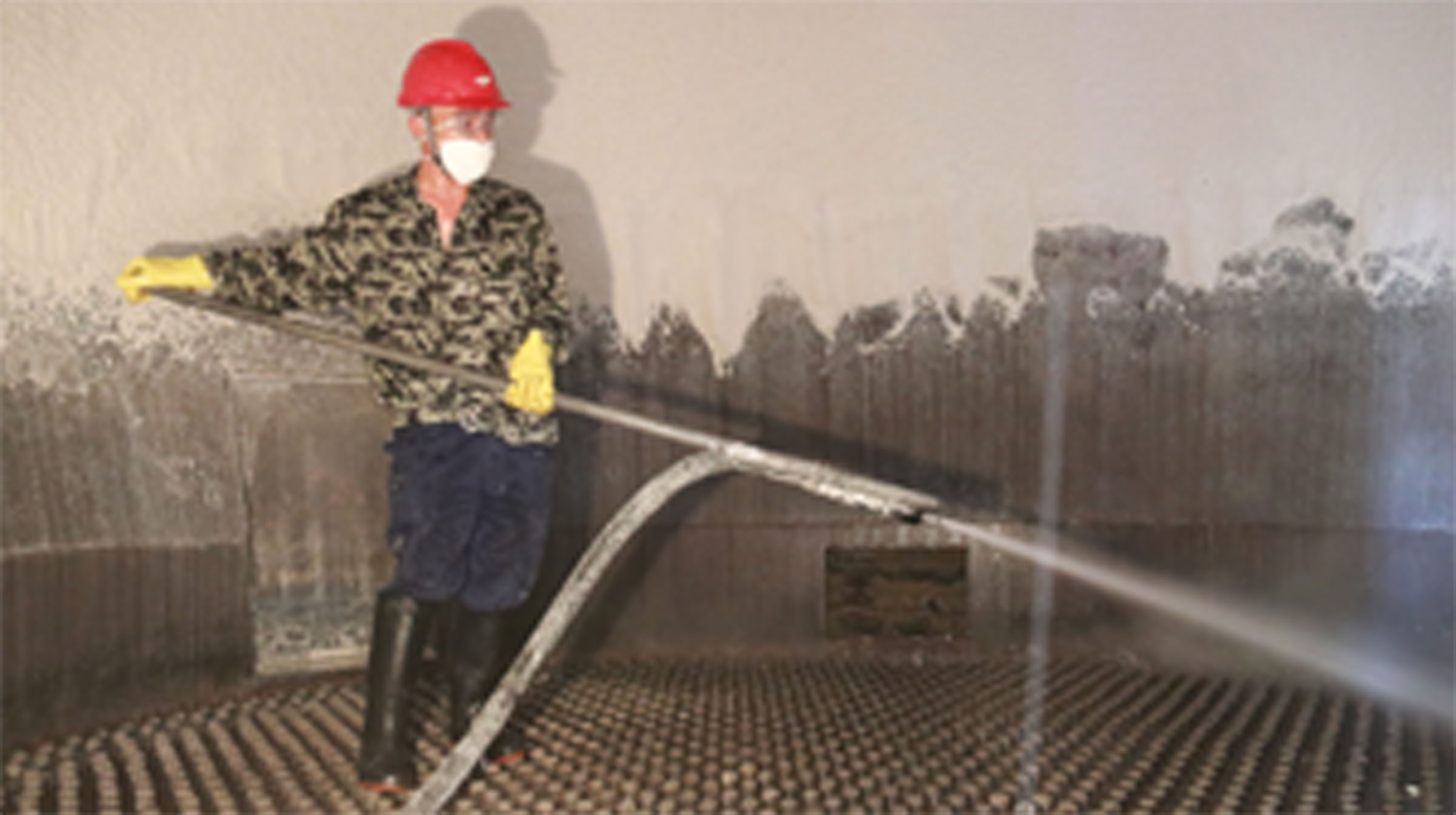 總部磷銨廠噴粉塔內(nèi)溫度高達(dá)80多攝氏度,塔內(nèi)異常悶熱。為保證正常生產(chǎn),該廠每2-3天都會用80多度的高溫?zé)崴畬λ?、床層進(jìn)行清洗。圖為該廠一生產(chǎn)班班長在塔內(nèi)清洗作業(yè)。