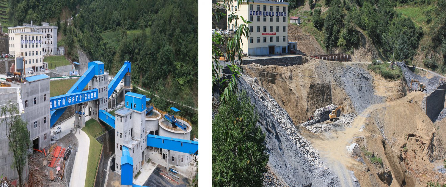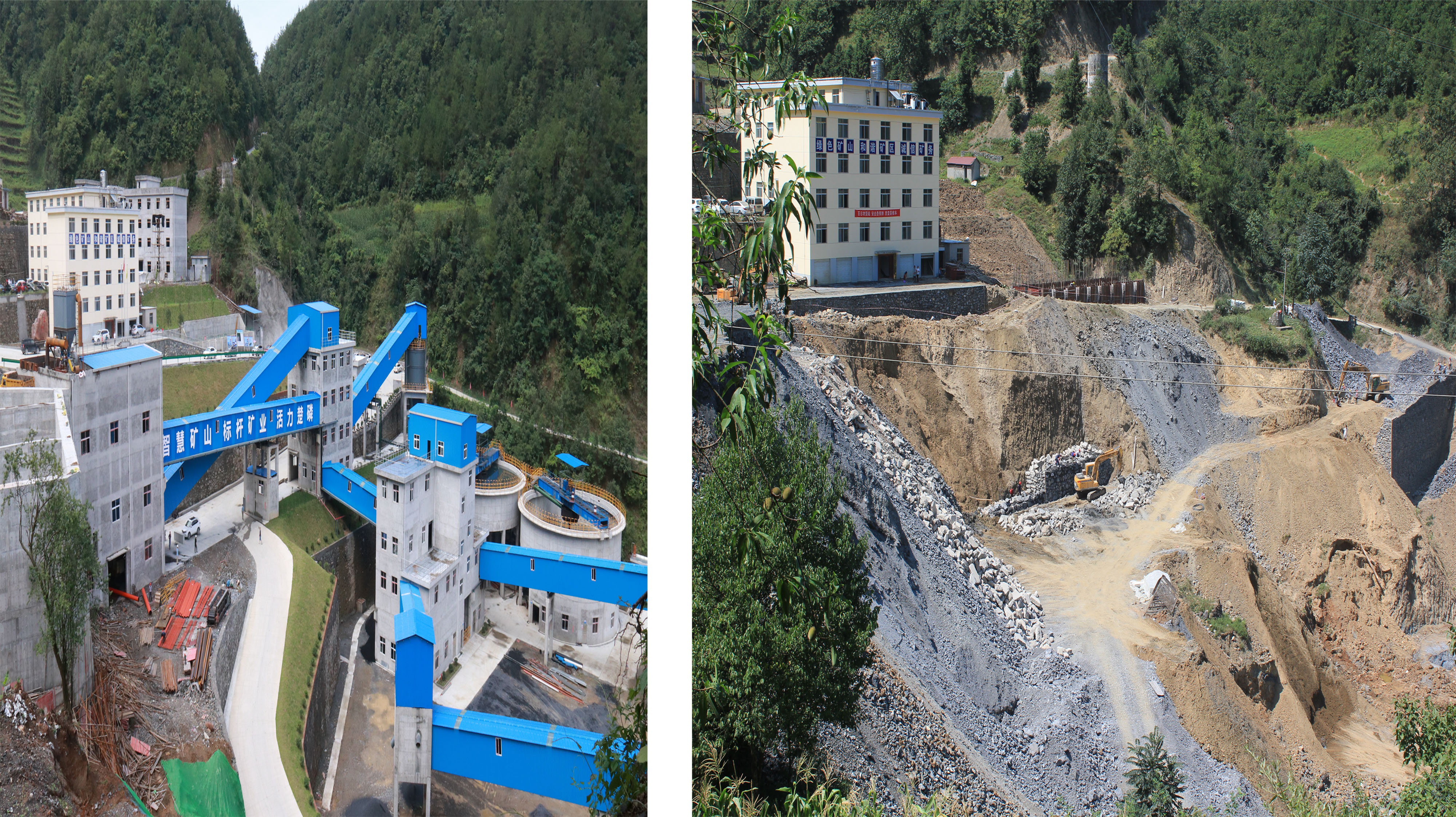 同一角度選礦廠建成前后對比照,左圖為2018年9月23日,選礦廠正進(jìn)行基礎(chǔ)施工;右圖拍攝于2019年8月1日,試生產(chǎn)中的選礦一角。