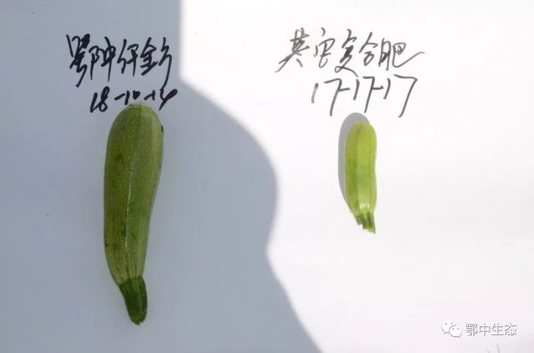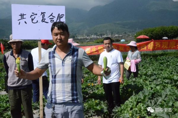 示范戶建光現(xiàn)場用事實說話:7月24日,我在1.2畝西葫蘆田里,其中0.6畝施用鄂中仟金方42%(18-10-14)做基肥25公斤,其中0.6畝地施用其他品牌復合肥(17-17-17)硫酸鉀做基肥35公斤。西葫蘆屬矮生品系,目前處于開花坐果期。示范田從整體長勢,開花坐果效果都非常明顯!葉片與對照田相比,長勢旺但不徒長,葉片寬大且濃綠,葉柄粗壯,葉片無病斑,無葉落枯黃,無一死苗;而對照田西葫蘆葉片暗綠無光,葉片窄小,出現(xiàn)小面積死苗;示范田植株密度1900株,對照田植株密度只有1700株,示范田植株高度和整齊度明顯強于對照田;莖稈圓且粗壯,主蔓粗短,側蔓少,花梗粗壯,開花多,花絲更長;雌雄同株授粉率高,雄花單生旺;開花后,幼瓜黃萎少,而對照田幼瓜黃萎多,示范田少打1-3次藥,省工省時,預測增產15%左右。