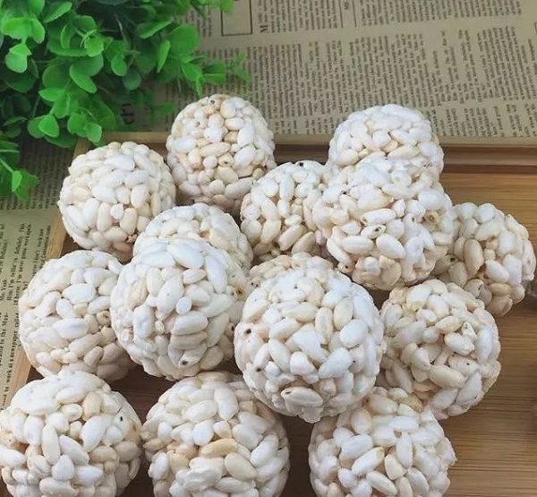 麥芽糖在鍋里慢慢熔化成糖稀,婆婆不時用筷頭挑一下,直到可以拉很長的糖絲兒了,就倒米子進去,快速翻炒,讓米子和糖稀融合在一塊兒,趁著熱時趕緊捏圓,大致成型的先放在鍋里,搭著熱氣,等所有的米子和麥芽糖都捏成圓球,最后再來一個個捏緊捏漂亮,就算完成整個制作了。