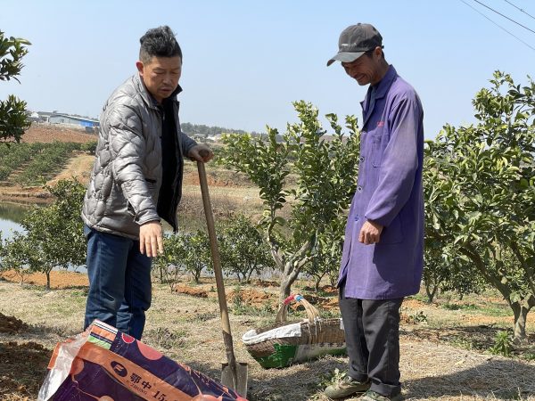 圖為何世勇(左)正在給柑農(nóng)示范施肥技術(shù)